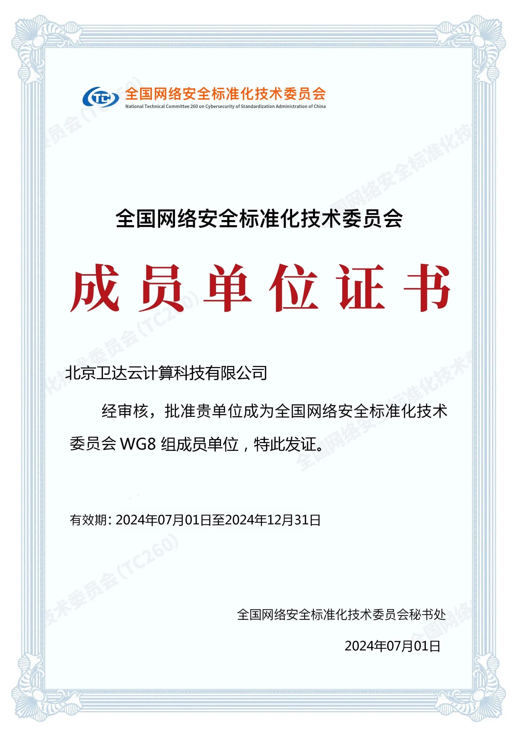 近日,全国信息安全标准化技术委员会公布新一批成员单位名单,卫达云计算顺利通过审核,入选“信安标委WG8—数据安全标准工作组”成员单位。